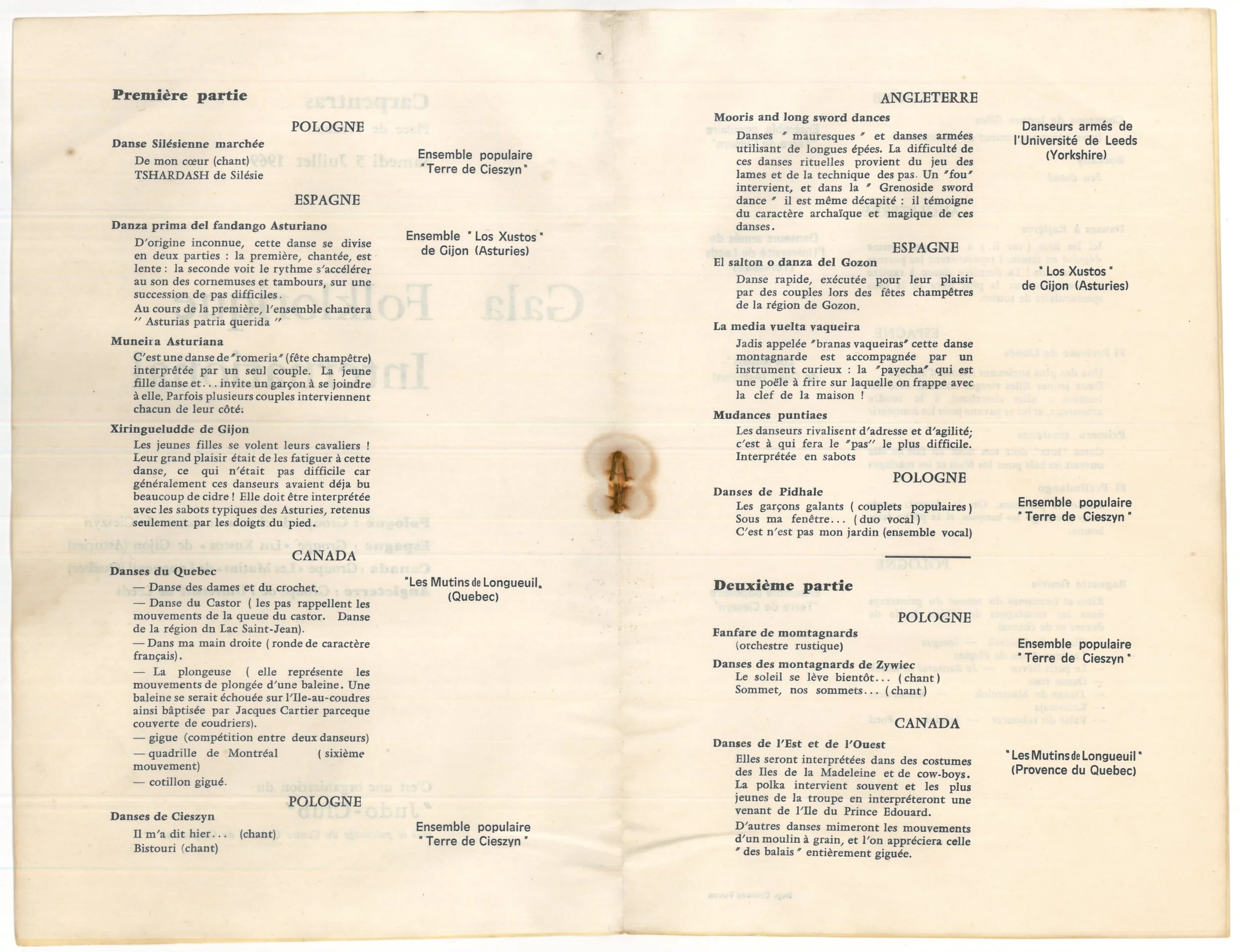 Pour la première fois de l’histoire du festival, un groupe canadien est présent. Nos amis français sont bien curieux de découvrir nos danses, à en juger par un article de journal où l’auteur se demande « quel folklore anime les habitants du nouveau monde? » Le folklore du Québec est-il resté français? Quelles traditions de la vieille France avons-nous conservées? « Nous le saurons ce soir, grâce aux Mutins de Longueuil qui sont à notre festival pour présenter leur folklore. » La tension est palpable!